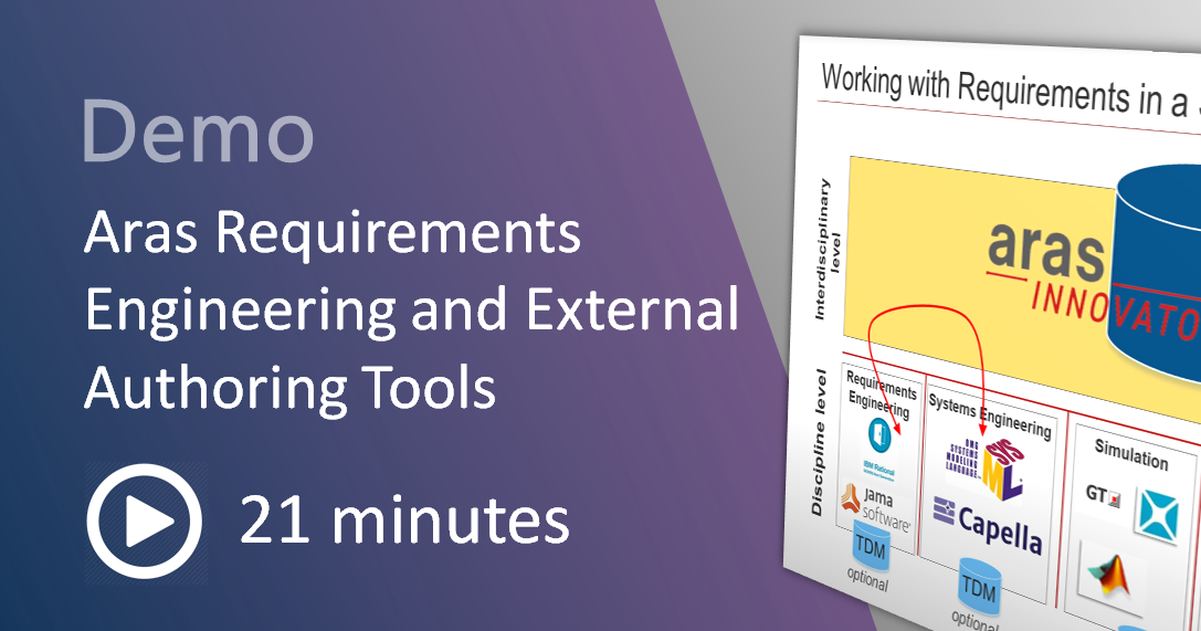 /Connecting requirements to system models, design details, simulations, and tests facilitates a traceable validation and verification process. Requirements Engineering (RE) application enables that as part of a digital thread managed by the Aras industrial low-code platform. This demo shows how to expose externally authored requirements in RE using: ReqIF—an industry standard for exchange of requirements; DOORS—a 3rd party requirements authoring tool; Cameo—a 3rd party MBSE systems modeling tool.